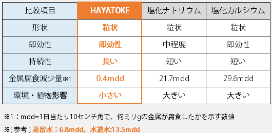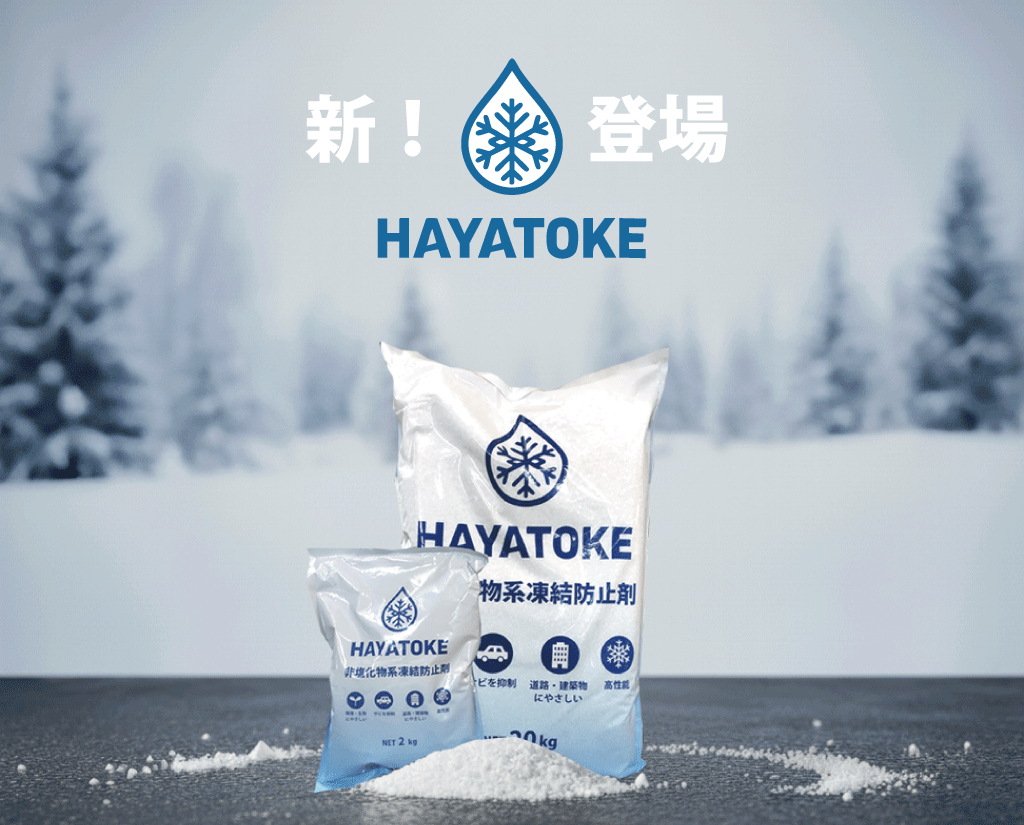 HAYATOKE(ハヤトケ)は、酢酸カリウムを主成分とした非塩化物系凍結防止剤です。
