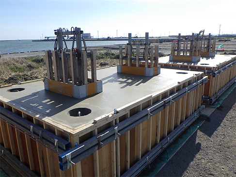 根固方塊ブロックの有孔部型枠「H-BOX」は設置・解体・転用が容易な箱抜き一体型枠で、北海道内100現場以上の実績が有ります。地組み不要で、狭い内枠の組みバラシが一切なく、四面一体で脱型でき、省力化・工期短縮を計ることが出来ます。