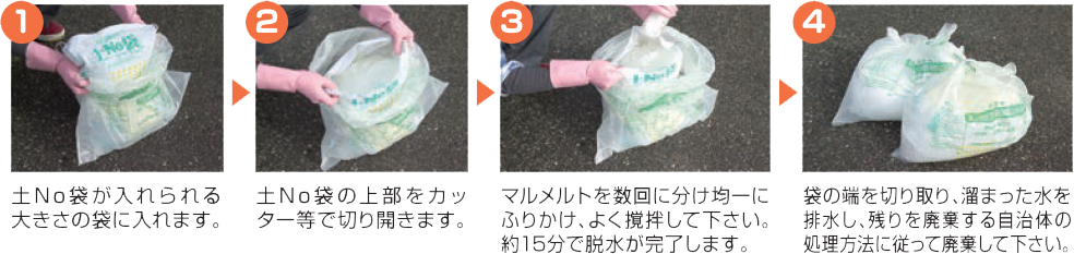 ・脱水処理を終えた土No袋は自治体の処理方法に従い廃棄してください。